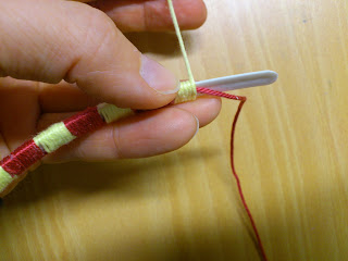 | Limma fast ena garnet i ena änden av diademet och börja snurra runt. Här har jag snurrat 10 varv/färg. |